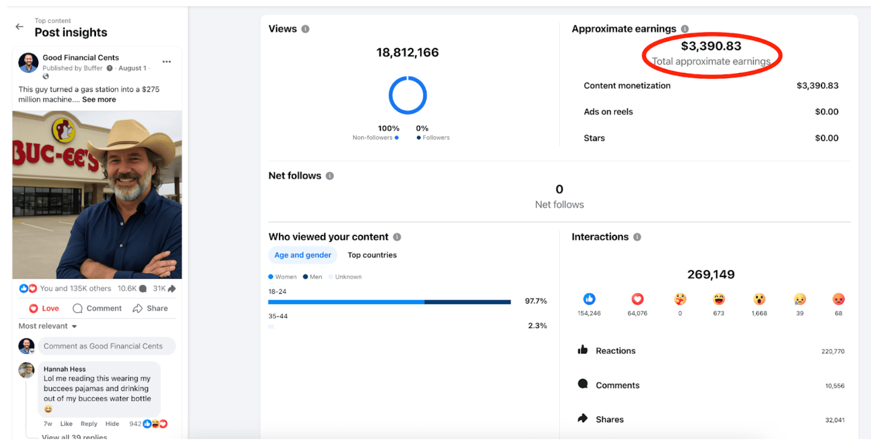 The primary one was about Buc-ee’s, the fuel station. And hear, I’m obsessed. I can’t drive by a Buc-ee’s with out stopping. Their brisket sandwiches and roasted almonds are unreal. So once I shared a submit concerning the origin story of Buc-ee’s, I had a reasonably good feeling it will hit. And it did. That single post reached over 18 million people, pulled in more than 269,000 interactions, and earned me $3,390.
