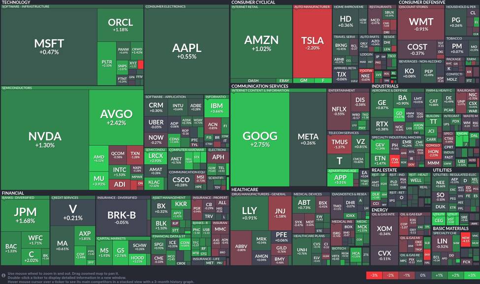 In the meantime, the client cyclical sector is exhibiting resilience, pushed by Amazon (AMZN)‘s climb of 1.02%. Nevertheless, not all firms are driving this wave; Tesla (TSLA) experiences losses, down by 2.20%, highlighting investor warning within the auto manufacturing area.
