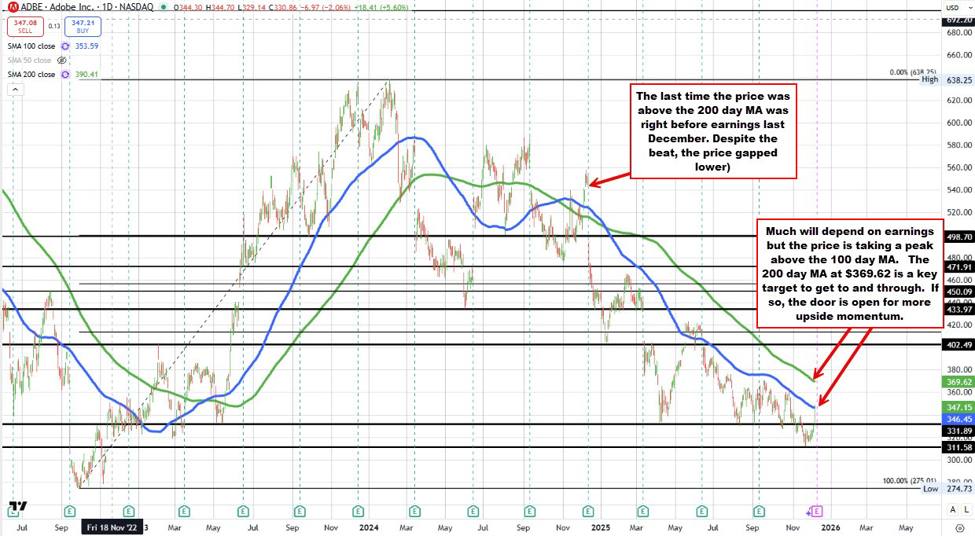 Trying on the every day chart above, right this moment’s rally has pushed Adobe simply above the falling 100-day shifting common at $346.45. That’s a significant growth. The final time the inventory poked above this degree—on October 28—it failed shortly, reversing decrease and starting the slide that in the end led to the 2024 low at $311.58 on November 21. For patrons, merely touching the 100-day shifting common isn’t sufficient; getting above it and staying above it is what shifts the broader bias of their favor.