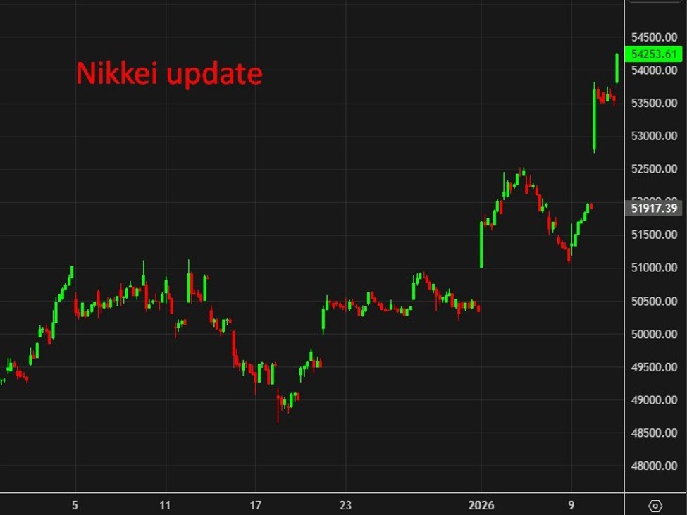 Markets have interpreted the prospect of an early election as fiscal-positive. Japanese shares surged for a second straight session, with the Nikkei 225 rising as a lot as 1% on Wednesday to interrupt above the 54,000 degree for the primary time, following a greater than 3% achieve the earlier session. The broader Topix additionally prolonged report highs, including round 0.6%.