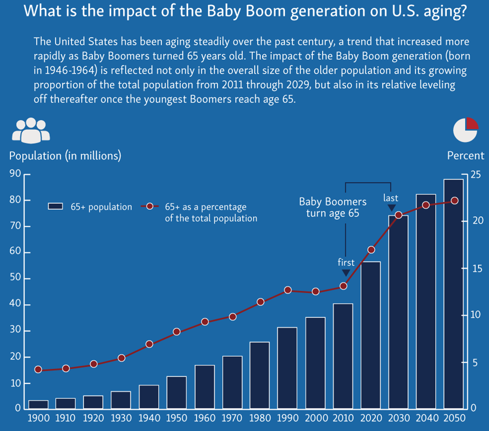 By 2030, each Child Boomer will likely be 65 or older – and the U.S. Census Bureau tasks that the 65+ inhabitants will swell to about 73 million People, turning at present’s spending development into tomorrow’s tidal wave of demand.