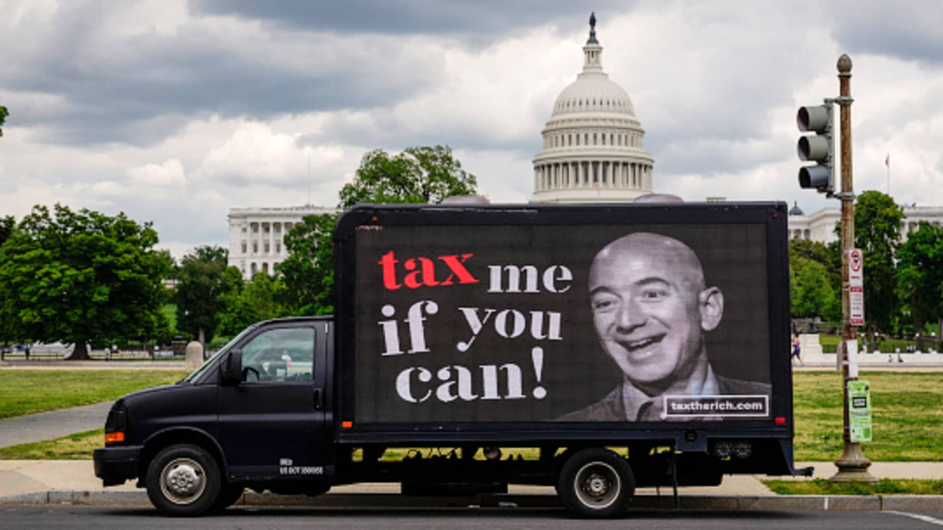 A cellular billboard with a picture of Jeff Bezos requires increased taxes on the ultrawealthy, in Washington, Could 17, 2021.