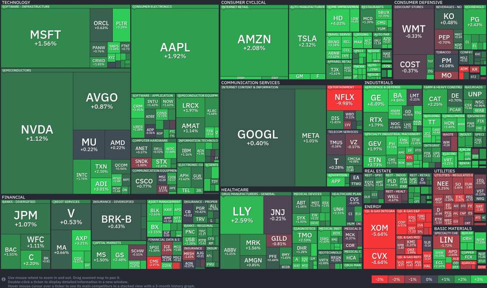 - 🔥 Power: Power giants like ExxonMobil (XOM) and Chevron (CVX) are down 5.64% and 4.64%, including purple to the sector resulting from falling oil costs and potential demand considerations.